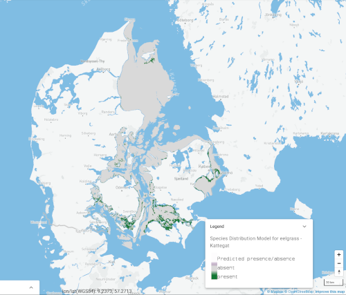 A map predicting distribution of habitats of important WFD indicator species Zostera marina in Danish waters. Based on Machine Learning statistical approach (Random Forest model) using data layers including eelgrass coverage data from Danish monitoring program together with environmental data layers such as maximum wave exposure, temperature, light at seabed and Sediment. The code repository is here
